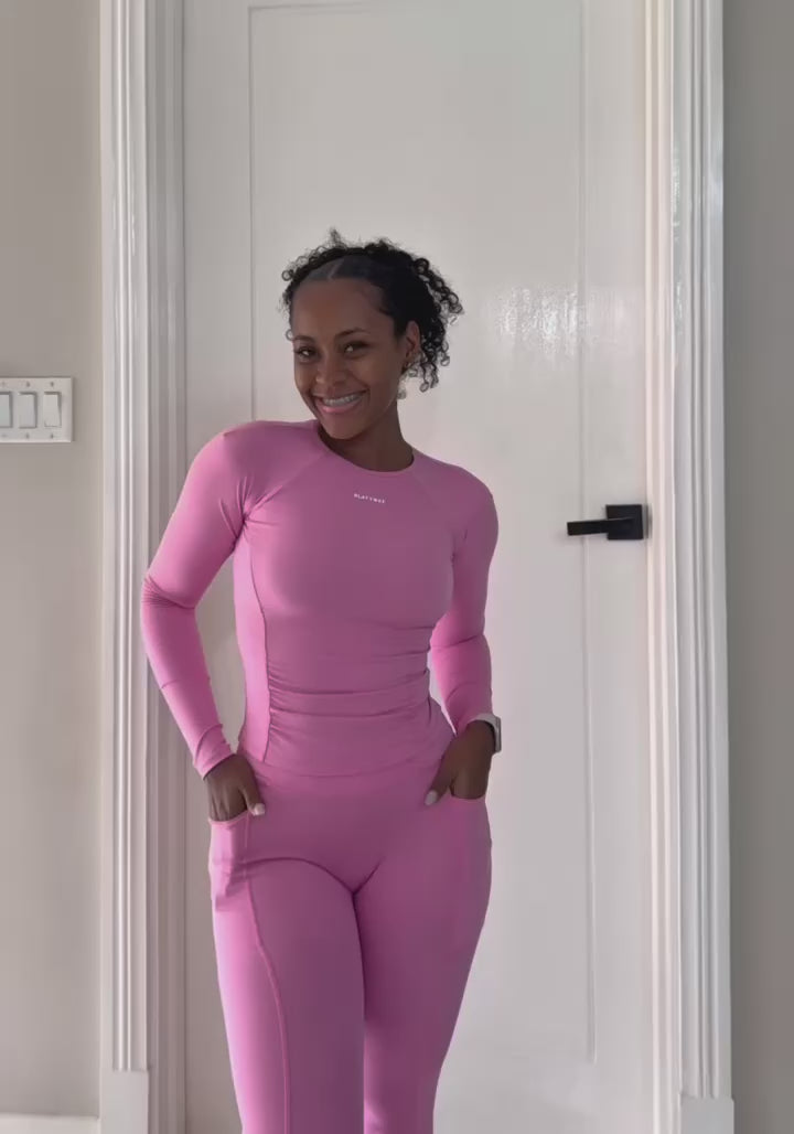 The Amour Long Sleeve is designed to enhance your natural shape with a smooth, sculpting fit that flatters from every angle. Featuring soft contour seams and subtle ruching through the midsection, this top creates a curved silhouette that defines the waist while staying comfortable and breathable. The buttery stretch fabric hugs the body without feeling restrictive, making it perfect for workouts, everyday wear. Paired with matching Leggings designed to sculpt, lift, and move with you while delivering a sleek, flattering fit . also comes with mini pockets .